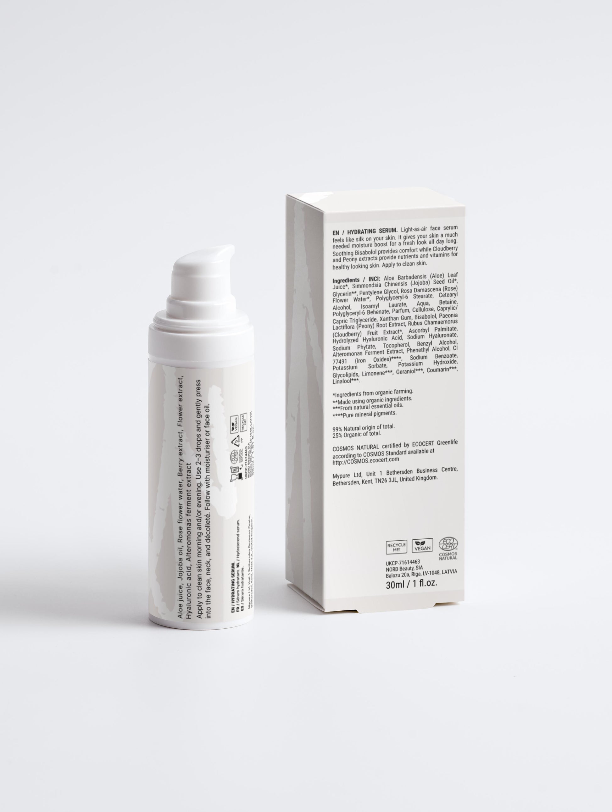 The Hydrating Serum is a silky, lightweight formula that delivers an immediate moisture surge and long-lasting hydration. Powered by multi-molecular Hyaluronic Acid, it helps to plump and smooth the skin, leaving it fresh and supple throughout the day. Bisabolol provides soothing comfort, while extracts of Cloudberry and Peony supply antioxidant vitamins that brighten and support a healthy skin tone.