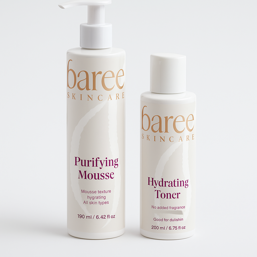 The Essentials Duo is your go-to pairing for clear, comfortable, and hydrated skin. Start with the Purifying Mousse, a lightweight foam cleanser enriched with organic Aloe, Sage, and Blackberry extracts to gently lift impurities, remove excess sebum, and leave skin feeling fresh. Follow with the Hydrating Toner, infused with organic Rose Water, Chamomile, and Hyaluronic Acid to rebalance pH levels, replenish moisture, and prepare the skin for your next steps.